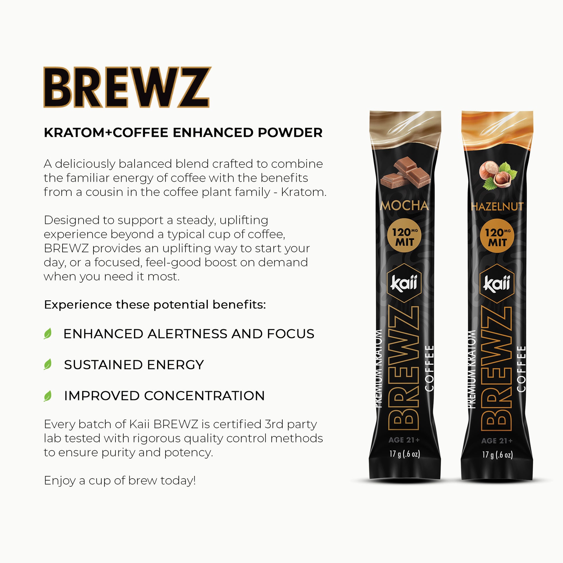 Meet Kaii BREWZ - a premium kratom coffee powder that delivers an authentic coffee taste and alertness within a strong yet balanced 120mg MIT. We combined the natural kick of coffee with the smooth, long-lasting lift of kratom. Unliked quick caffeine spikes that fade fast, this plant-powered blend delivers steady energy and focus—without the crash. It's a clean, balance way to fuel your day.