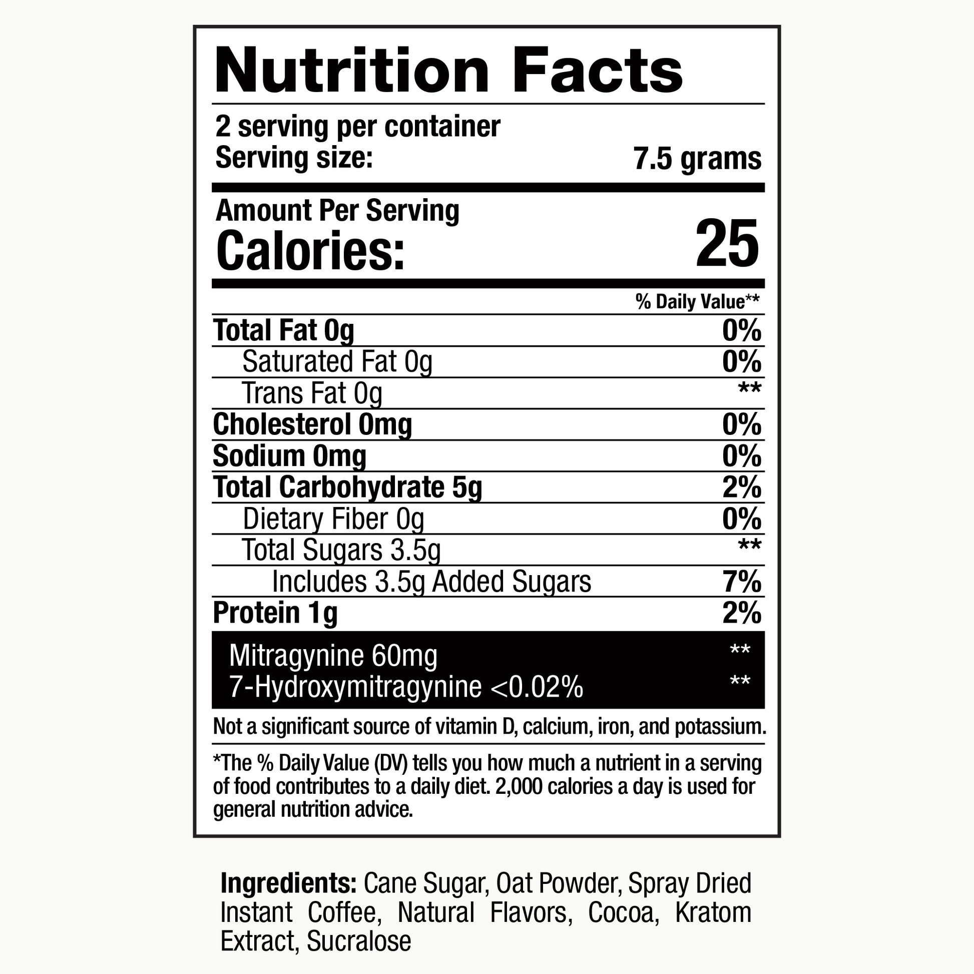 - Enhanced powder with natural caffeine from coffee, and premium Kratom leaf extract